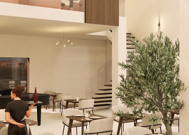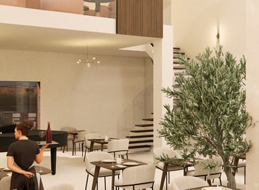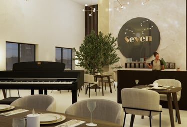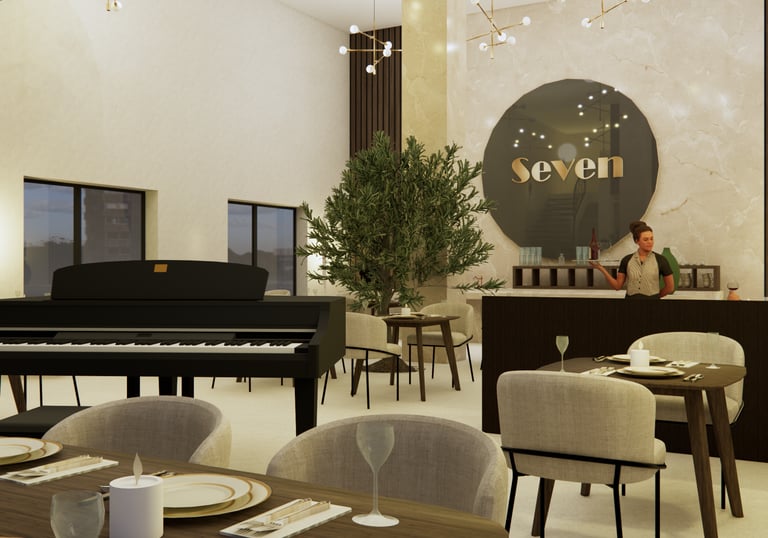 Conception du restaurant Le Seven, alliant modernité et touches méditerranéennes pour créer un espace chaleureux et élégant