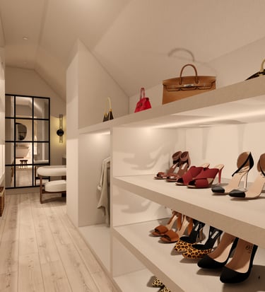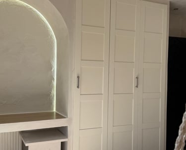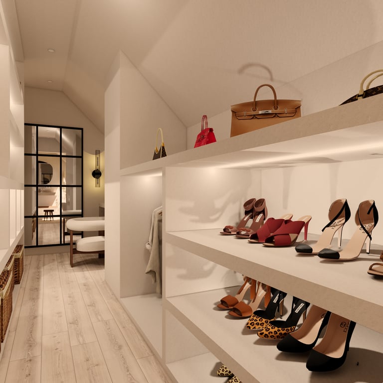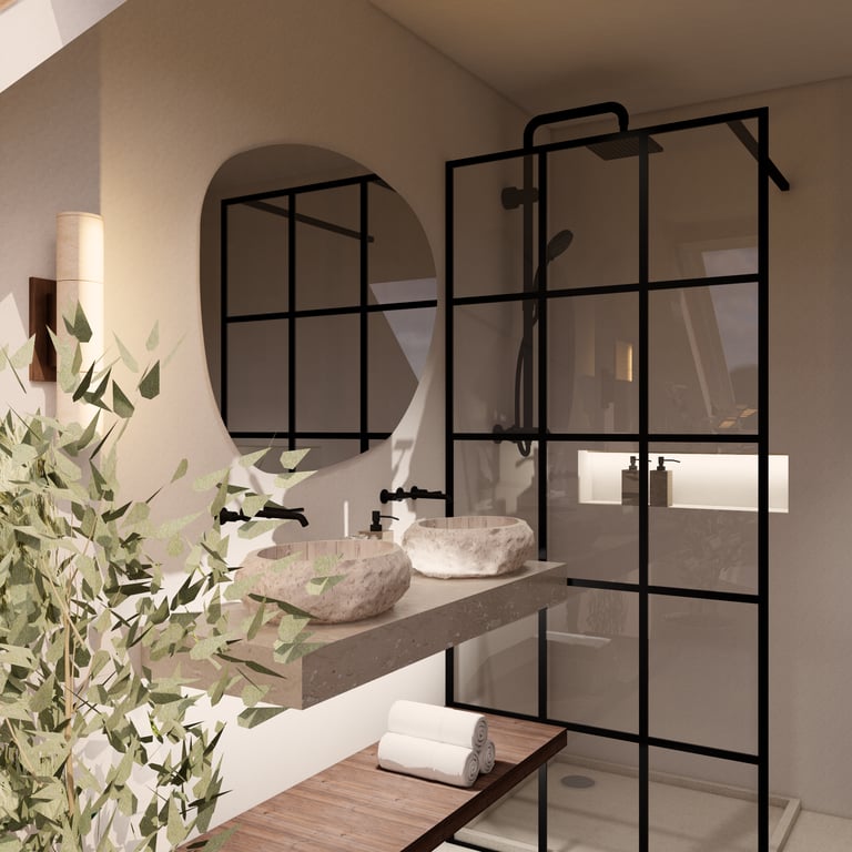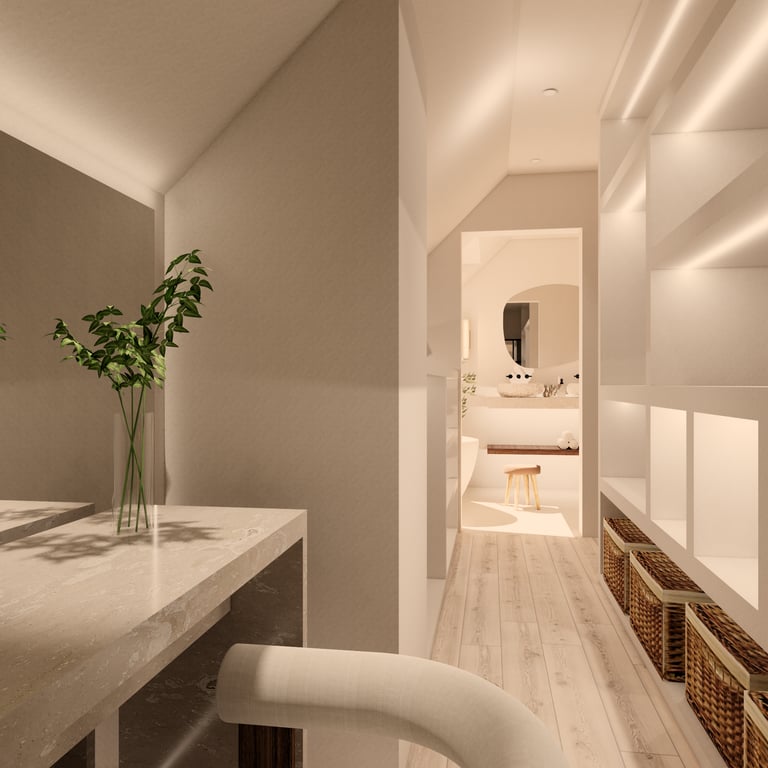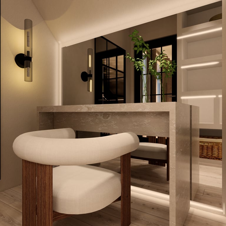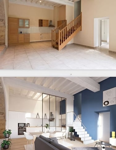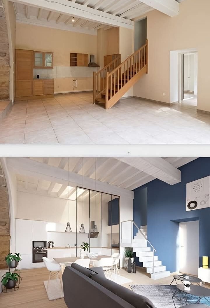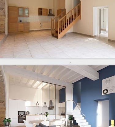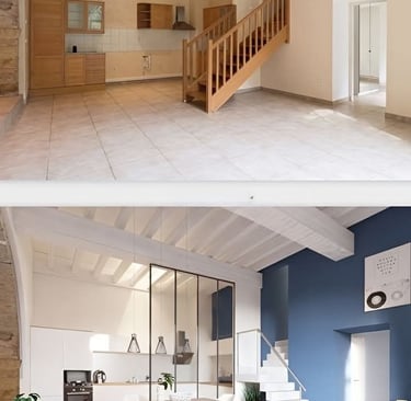 Dans ce duplex, j’ai entièrement repensé les volumes pour créer un espace fluide, lumineux et fonctionnel. La cuisine a été redessinée et positionnée différemment, tandis que l’escalier a été réorienté pour offrir une meilleure accessibilité ainsi qu’une zone de rangement optimisée. Au rez-de-chaussée, l’ajout d’une verrière a permis de séparer la cuisine du séjour tout en conservant une belle ouverture visuelle, donnant naissance à un ensemble salon–salle à manger–cuisine semi-ouvert, chaleureux et cohérent. À l’étage, la chambre parentale a bénéficié d’un design sur mesure, offrant un espace élégant, harmonieux et pensé dans les moindres détails.