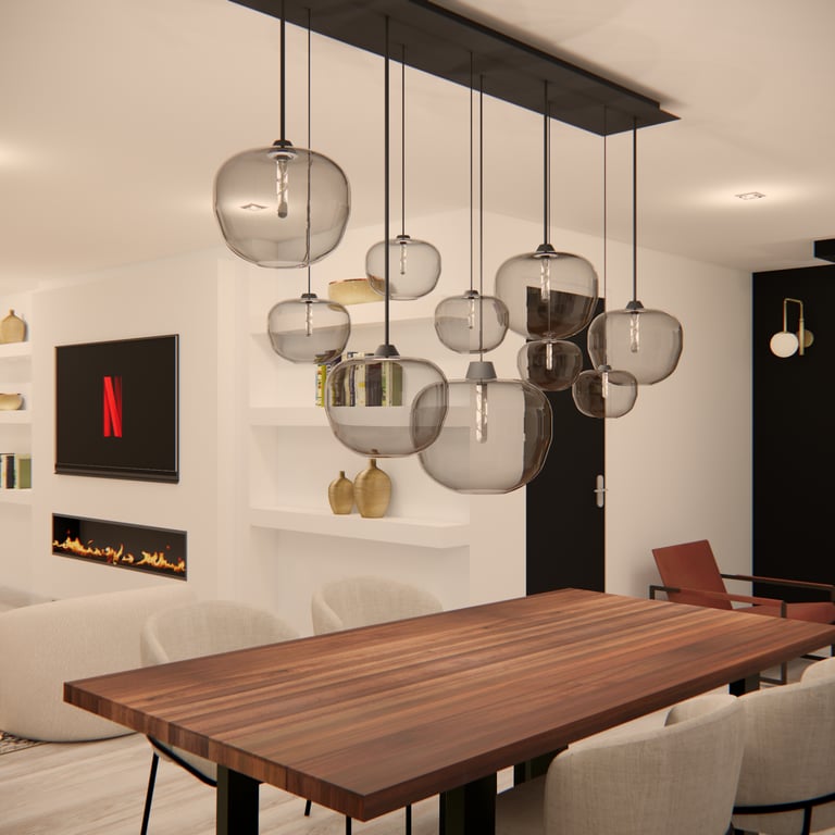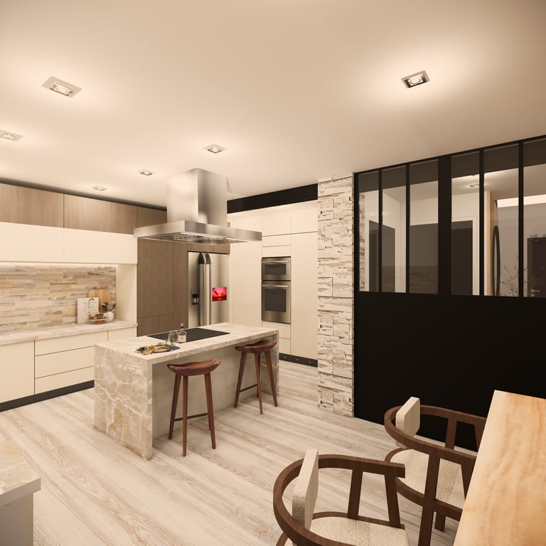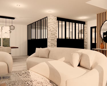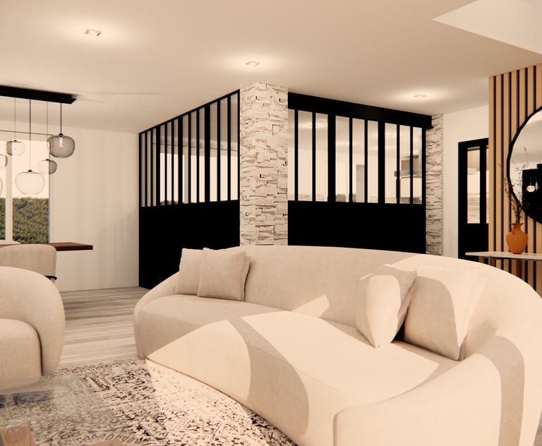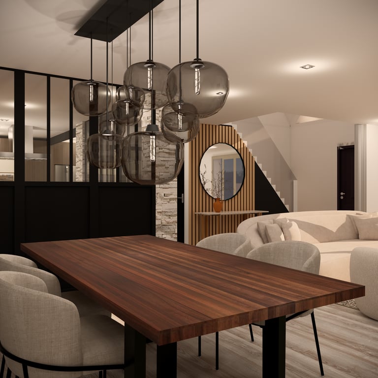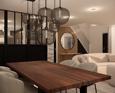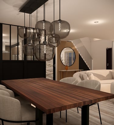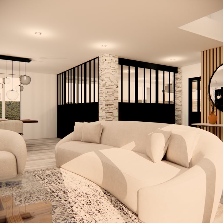 Aménagement d’un espace de vie semi-ouvert, séparé par une verrière au style industriel, tout en préservant une atmosphère chaleureuse et accueillante. L’objectif : harmoniser les volumes, optimiser la circulation et créer une cohérence esthétique entre le salon, la salle à manger et la cuisine, en mêlant élégance, modernité et confort.