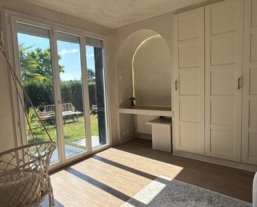 Ce projet consistait à transformer une pièce de passage en un espace multifonction harmonieux, capable d’accueillir à la fois une chambre d’amis, un coin bureau pratique, des rangements optimisés et un véritable espace de détente.