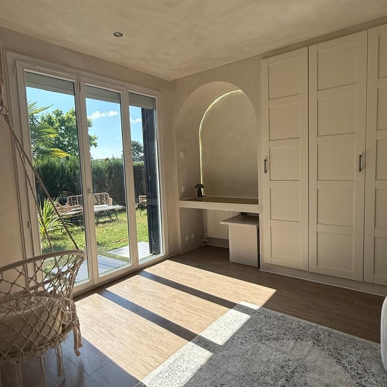 Malgré les contraintes d’une pièce traversante dotée de deux portes, j’ai repensé chaque mètre carré pour créer un lieu chaleureux, fluide et parfaitement adapté aux différents usages du quotidien, sans jamais sacrifier l’esthétique ni le confort.